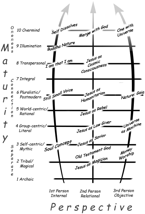 This gives us three perspectives and ten developmental stages or thirty different lenses through which to view God, Spirit, ultimate reality or what’s ultimately most important in life. The philosopher Ken Wilber refers to these as cosmic addresses.[3] They can be fun to play with.